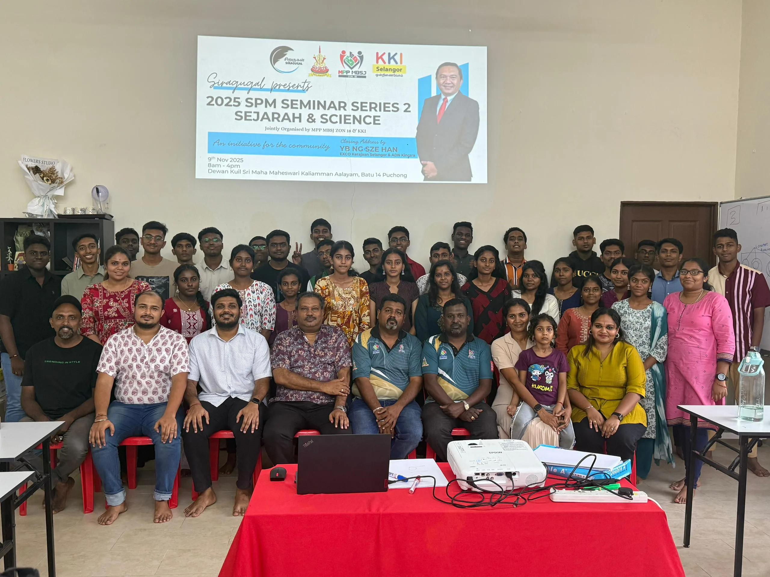 Siragugal, a youth led non-governmental organization dedicated to uplift community through education and youth development. On November 9, 2025, Siragugal successfully organized the SPM Seminar Series 2: History & Science, in collaboration with Selangor Indian Community Leader Mr. Siva Krishnan, MBSJ Zon 18, and the management committee of the Sri Maha Maheswari Kaliamman temple.