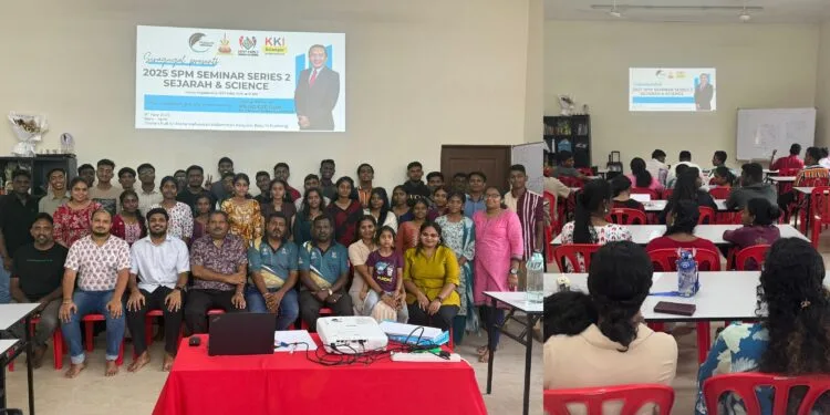 The seminar, held at Sri Maha Maheswari Kaliamman Aalayam Hall, Batu 14, Puchong, gathered 60 Form 4 and Form 5 students for an engaging and educational session. The programme featured two experienced facilitators, Mr. Kalai (History) and Ms. Subha (Science), who delivered interactive and insightful lessons, equipping students with effective study strategies, last-minute revision tips, and renewed confidence in facing their upcoming SPM examinations.