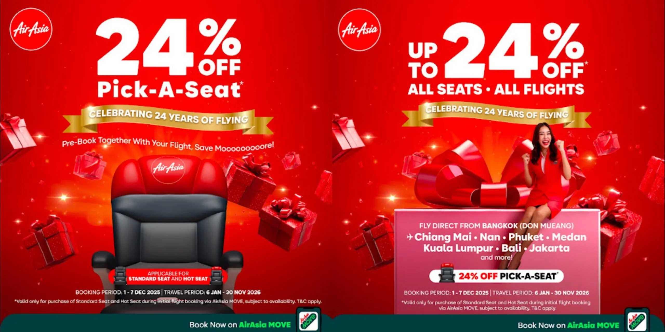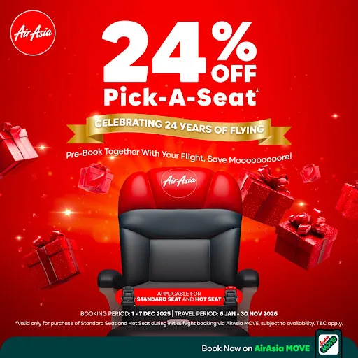 AirAsia is celebrating its birthday by offering a fare discount along with an additional 24% off seat-selection fees for both Standard Seats and Hot Seats if passengers book during their initial flight reservation. This means travelers can enjoy both lower fares and reduced seat selection costs. AirAsia encourages everyone to take advantage of this promotion and book early to secure some of the most affordable fares for travel in 2026.