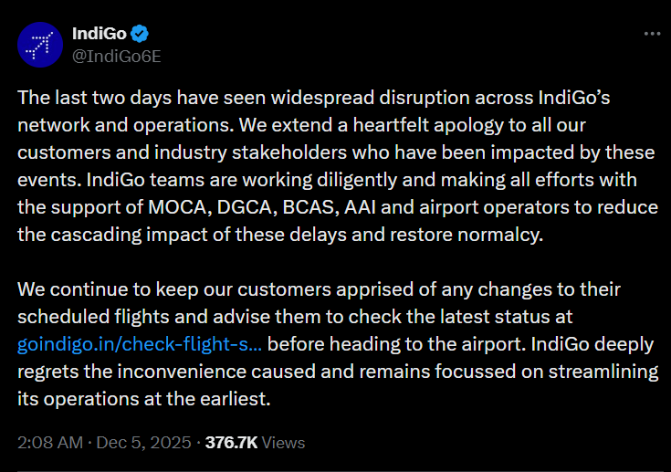 Indigo has issued a official public apology saying that the disruptions resulted from a “cascading impact” of crew unavailability, and peak travel congestion. The airline said it is reallocating aircraft, adjusting schedules and working to restore normal operations.
