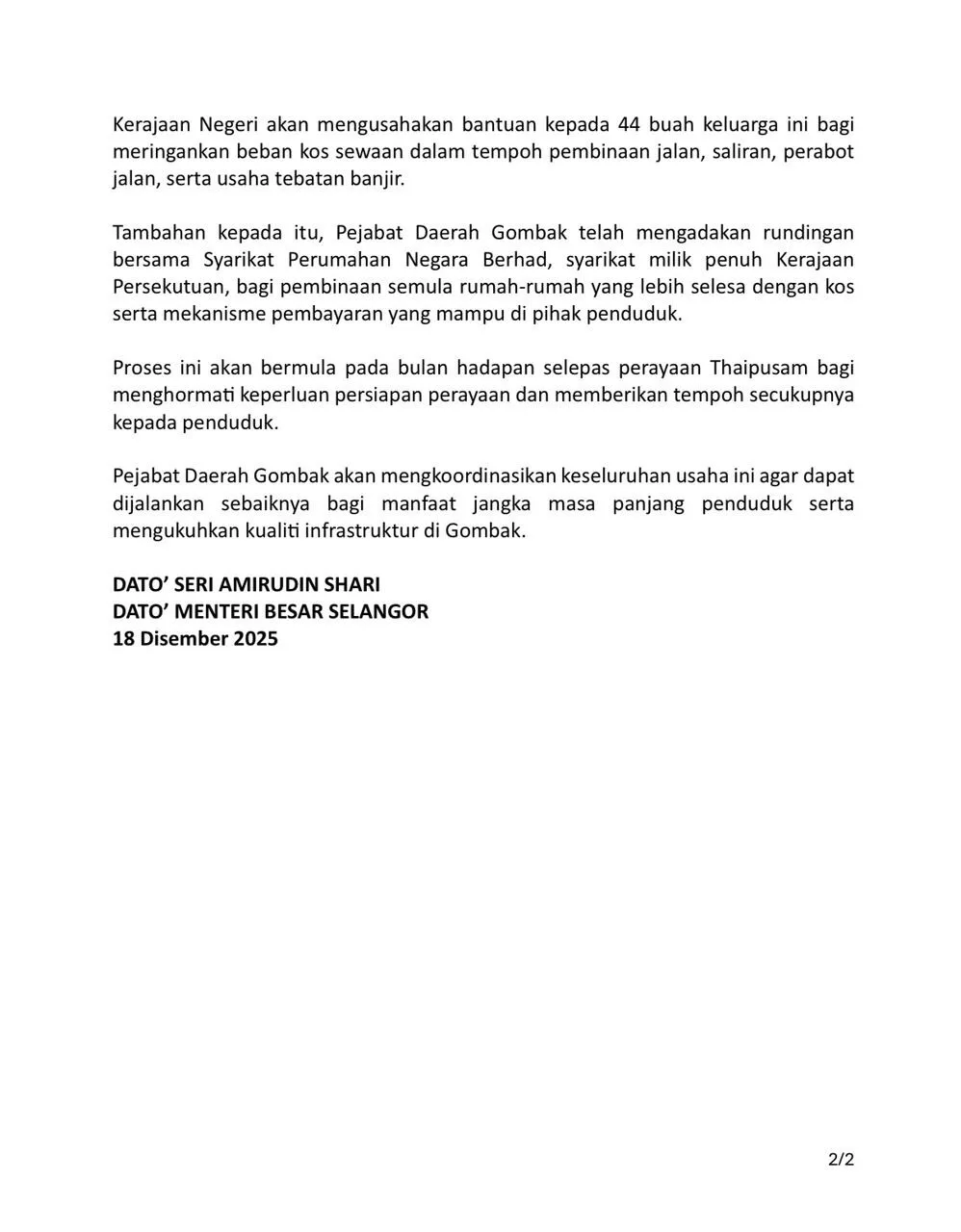 Menteri Besar Datuk Seri Amirudin Shari said the aid is aimed at easing the residents burden during the relocation process, including support for rental costs, as well as provisions during the construction of upgraded road and drainage systems. The state will also implement flood mitigation measures to ensure residents long-term safety and comfort.