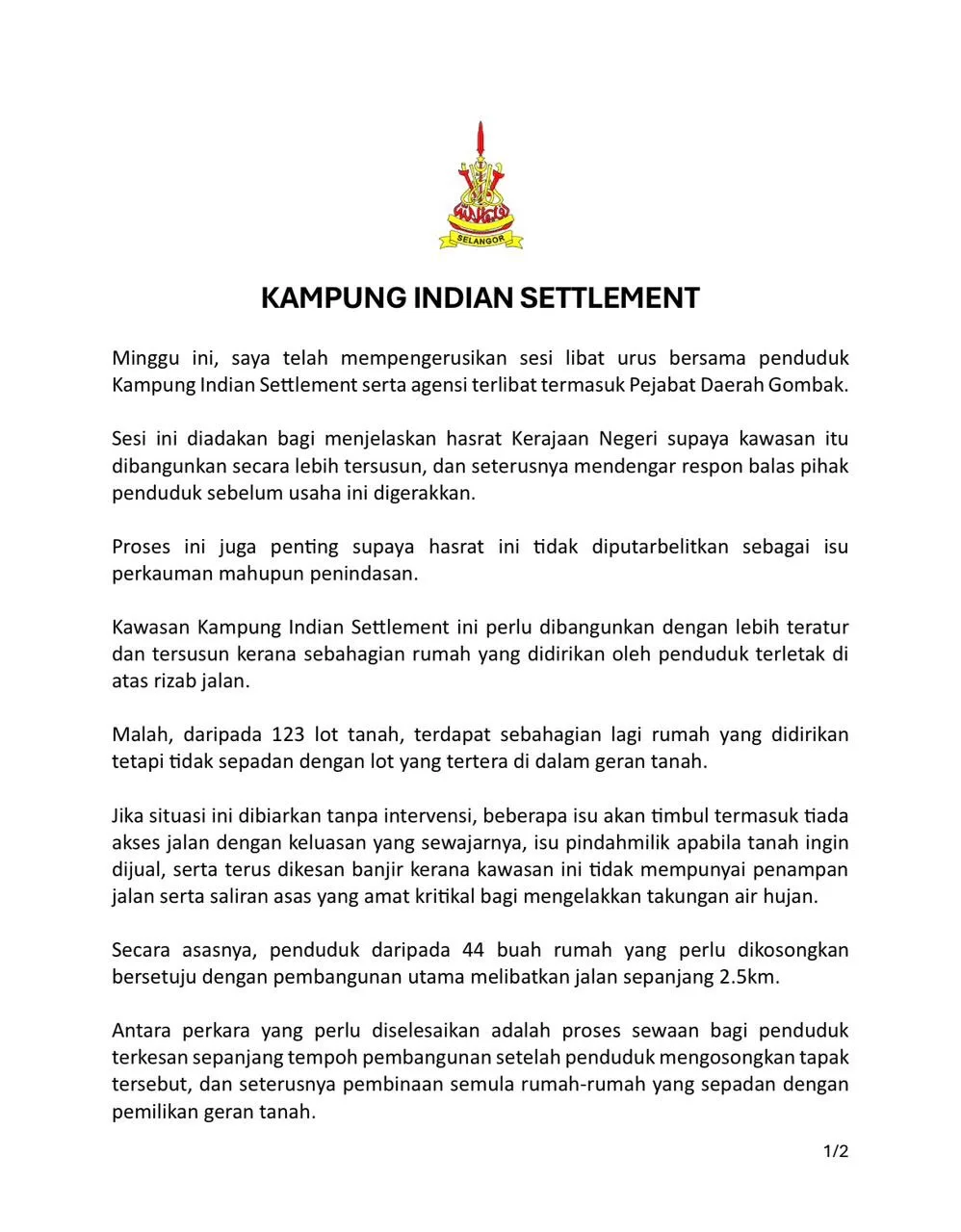The Selangor government reiterated that the initiative is guided by people-centric values, assuring that residents welfare remains a key priority as the state undertakes development efforts intended to improve safety, infrastructure and living standards in Gombak.