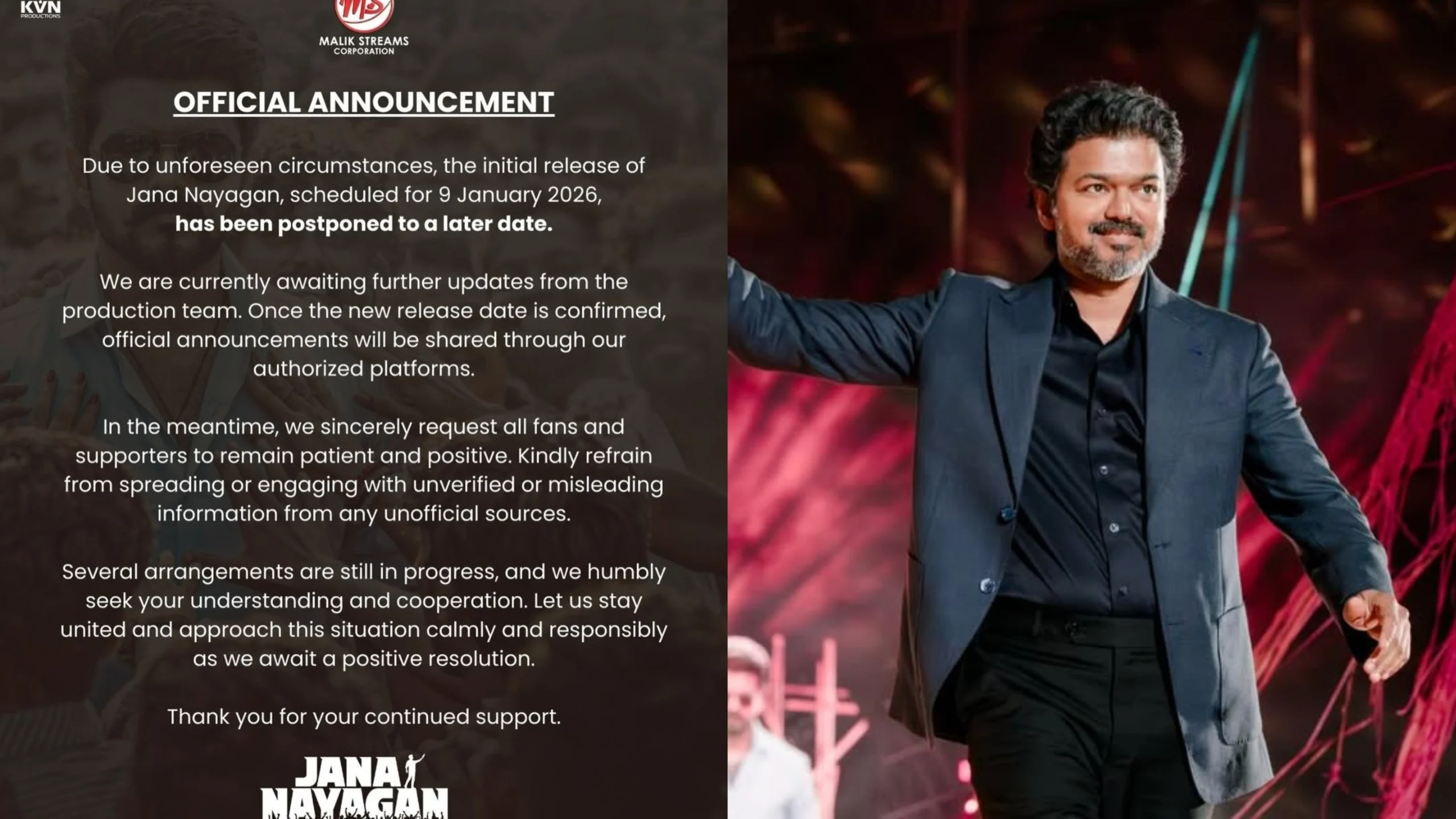 The much-anticipated Jana Nayagan, billed as Thalapathy Vijay’s final film, will no longer release on it’s previously announced date of 9th January, 2026. The update was officially shared by Malik Streams Corporation, citing unforeseen circumstances behind the delay.