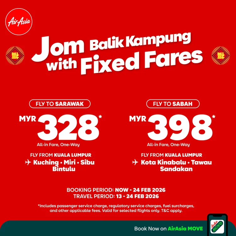 For the upcoming Lunar New Year period, travellers can enjoy all-in one fares of RM328 to Sarawak, covering routes from Kuala Lumpur to Kuching, Miri, Sibu, and Bintulu. Flights to Sabah are available at RM398 all-in one way, connecting Kuala Lumpur to Kota Kinabalu, Tawau and Sandakan. These fares are available for booking until 24th February 2026, for travel between 13th and 24th February 2026.