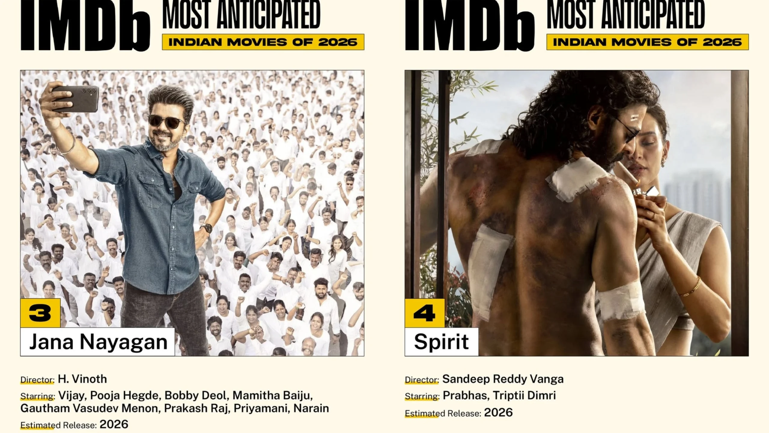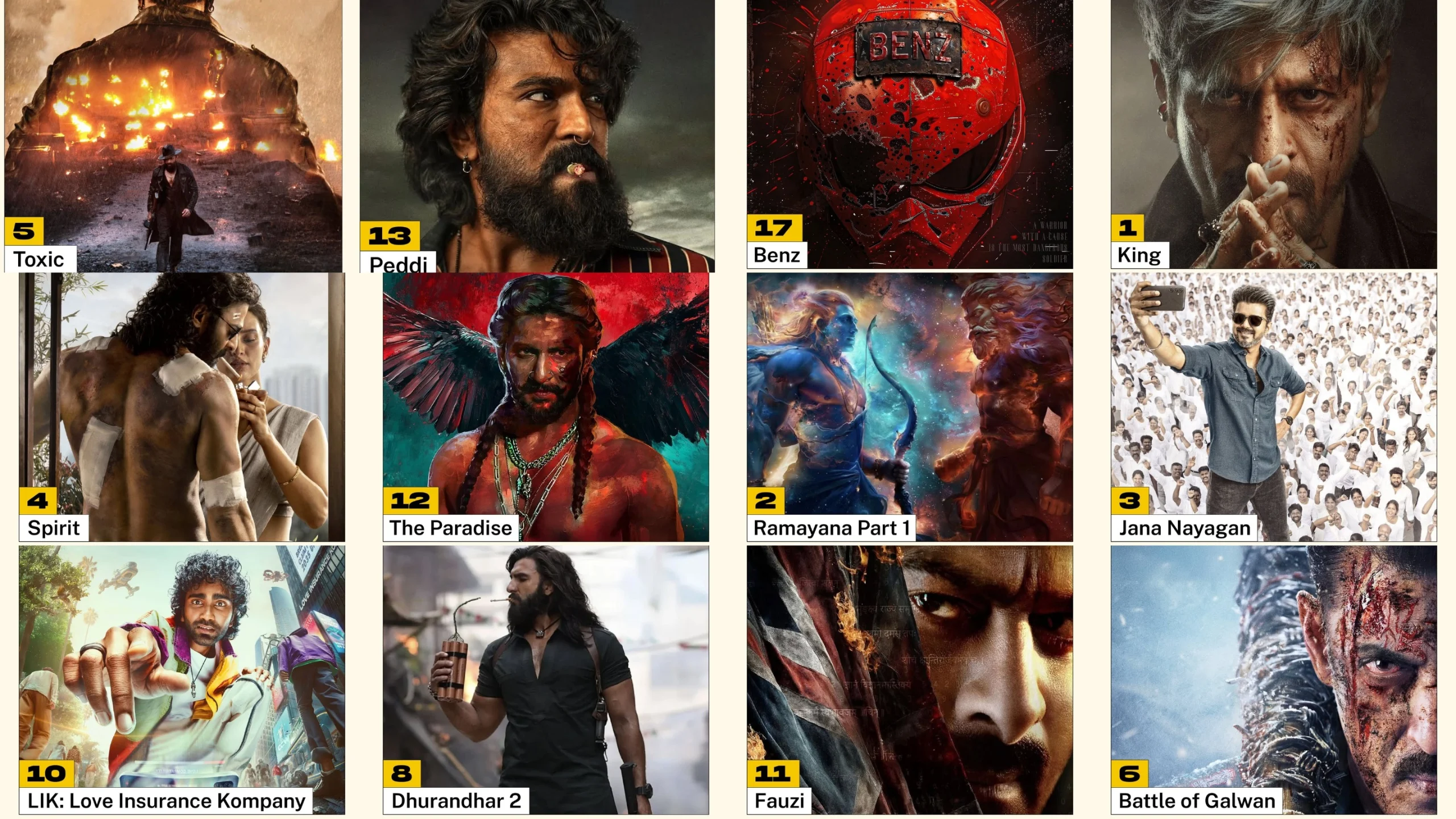 The Top 5 continues with Jana Nayagan (No.3), starring Vijay in a political role, Spirit (No.4), directed by Sandeep Reddy Vanga and led by Prabhas, and Toxic (No.5), with Yash headlining a stylized action drama.
