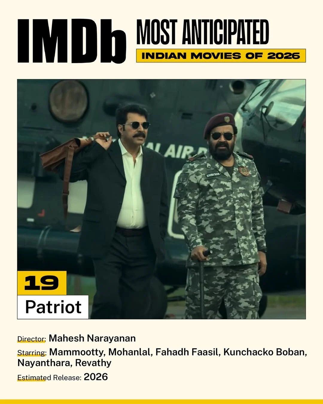 Shakthi Shalini (No.18), headlined by Aneet Padda, reflects growing interest in women-centric narratives. Meanwhile, Patriot (No.19), featuring Mammootty, Fahadh Faasil and Mohanlal, promises ideological depth and strong ensemble performances.