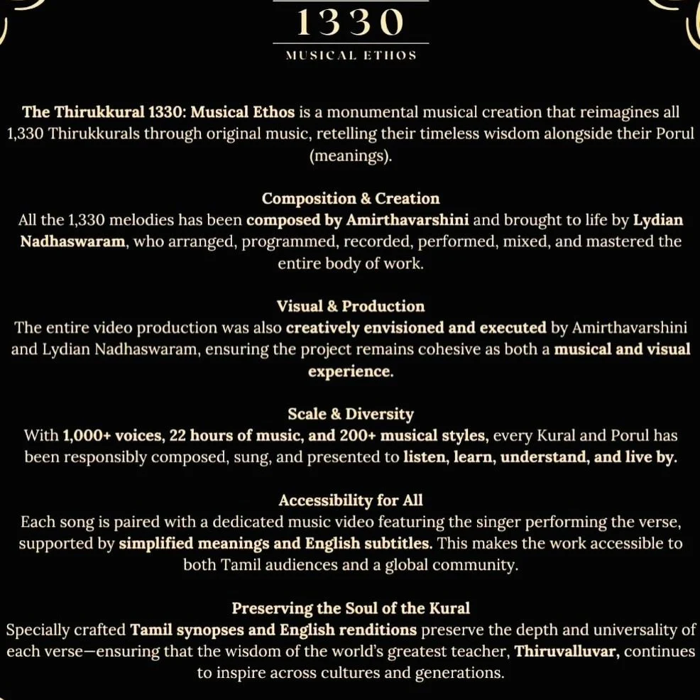 The Thirukkural 1330: Musical Ethos is more than an album. It is a cultural landmark, a rare moment where ancient wisdom meets contemporary global music through the vision of two young artists. By transforming Thiruvalluvar’s verses into sound, Lydian and Amirthavarshini ensure that the Thirukkural is not only read but sung, heard, and lived.