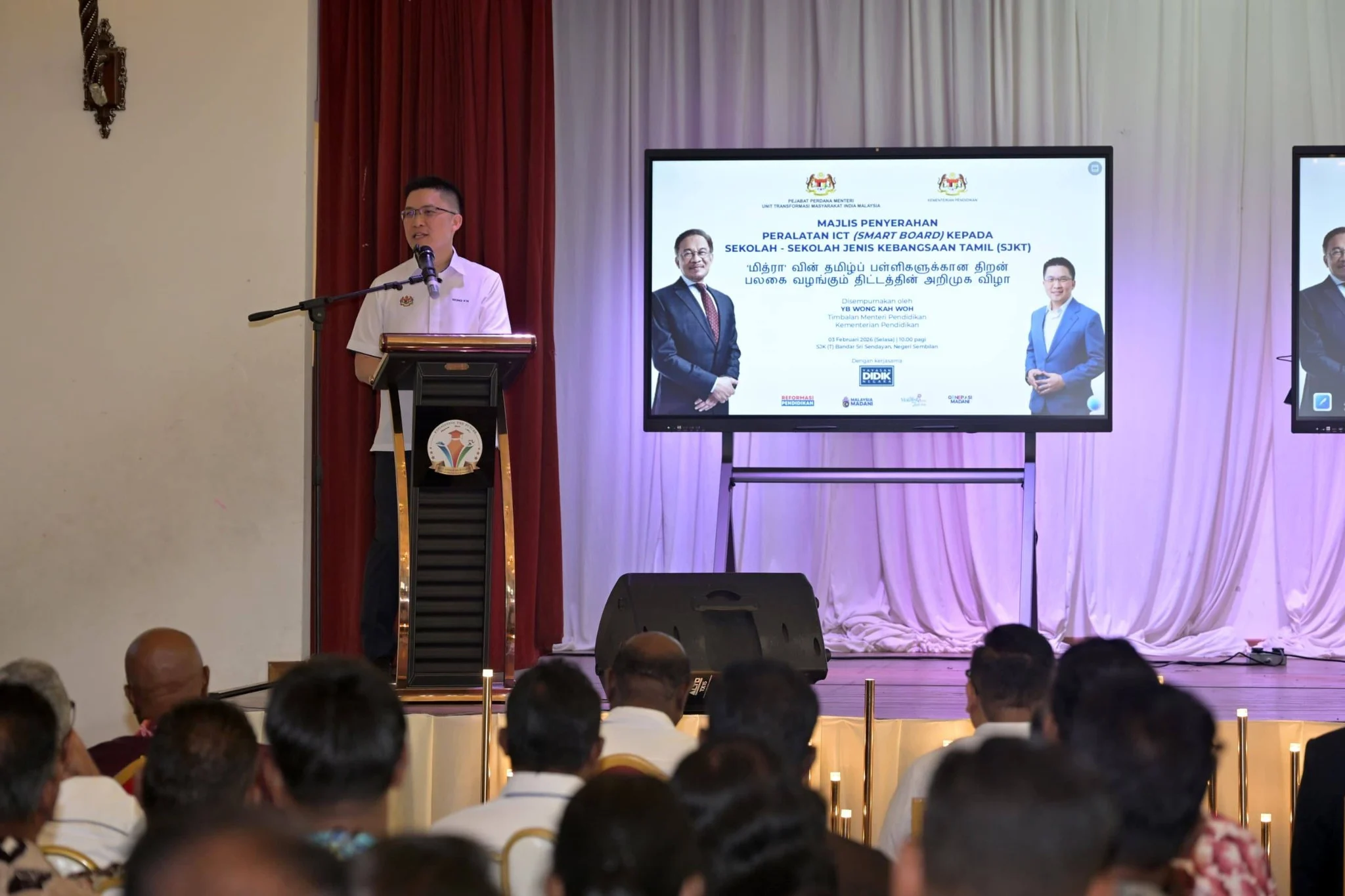 The Deputy Minister of Education, YB Wong Kah Woh, officiated the ICT Equipment (Smart Board) Handover Ceremony to 45 Tamil National-Type Schools (SJKT) in Negeri Sembilan at an event held at SJK (T) Bandar Sri Sendayan. The initiative marks a significant step towards enhancing digital learning infrastructure in Tamil primary schools across the state.