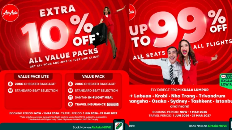 From now until 1st March 2026, travelers can enjoy discounted fares on all AirAsia and AirAsia X routes with flight codes AK and D7, available for booking via airasia.com and the AirAsia MOVE app. The promotional fares apply to travel dates between 1st June 2026, and 27th March 2027, making it an ideal opportunity to plan holidays well in advance.