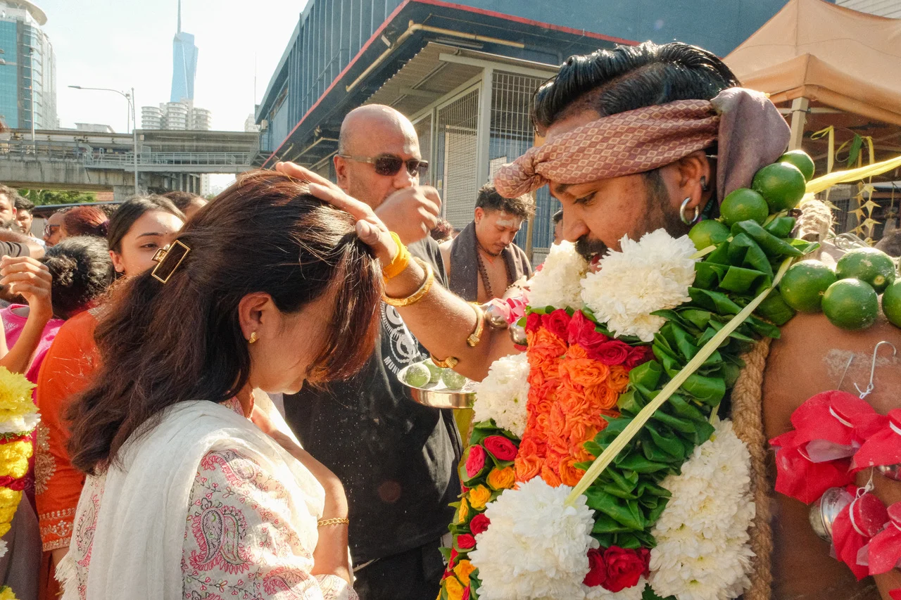 Long before the procession begins, preparation quietly unfolds. Limes are pierced with care, coconuts secured with precision, and bodies steadied through focus and restraint. What might appear extreme to an outside gaze is, within this space, a disciplined ritual approached with calm intention. There is no chaos here, only concentration, ritual memory, and collective purpose.