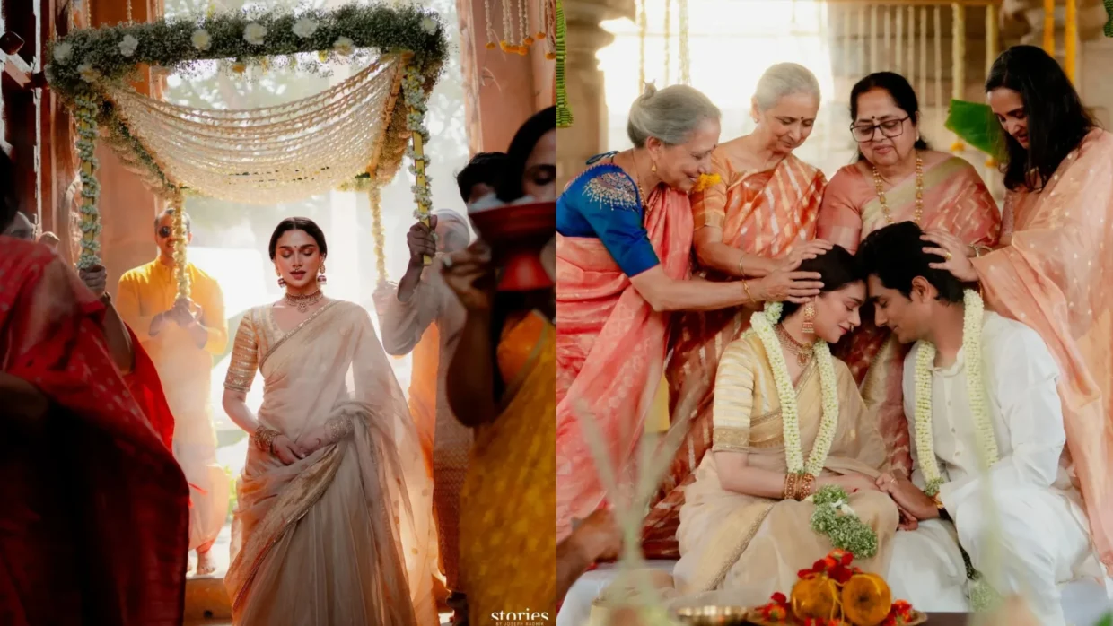 For Aditi Rao Hydari, the bridal look leaned into understated elegance, a traditional silk saree paired with heirloom-style jewellery, avoiding heavy layering or experimental silhouettes. Similarly, Keerthy Suresh chose a classic South Indian bridal aesthetic, rich silk, temple gold, and a drape that honoured ritual over reinvention.