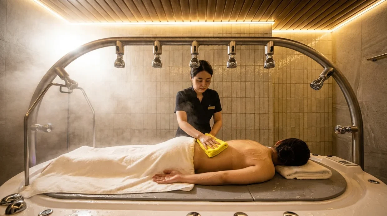 A key highlight of KANTIK is the authentic Korean Seshin body scrub, a ritual rooted in Korea’s bathhouse culture. Traditionally performed in communal settings, the experience has been transformed into a private, luxurious treatment. Using specialised mitts and warm water, therapist perform a deep exfoliation that removes impurities and leaves the skin feeling soft, smooth and renewed.