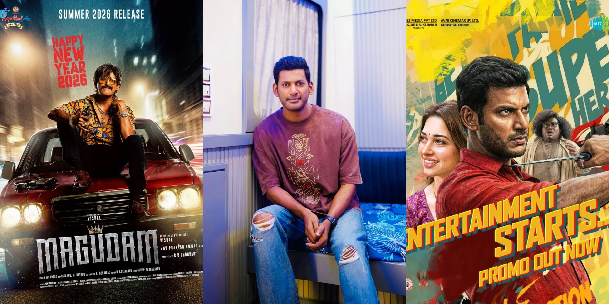 The movie has a strong ensemble cast including actress Dushara Vijayan, Anjali, and Yogi Babu, with GV Prakash composing the music. While the plot remains silent, early looks suggest that Vishal will be seen portraying 3 important characters. Alongside Magudam, Vishal is also working on Purushan, which reunites him with director Sundar C, and composer Hip Hop Tamizha after their collaboration in Aambala. The film stars actress Tamannah and Yogi Babu, continuing a series of successful collab between the actor and the director. Purushan is expected to be an action-comedy, catering on a seemingly gentle husband who conceals a more aggressive side from his wife, blending humor with action-driven storytelling.
