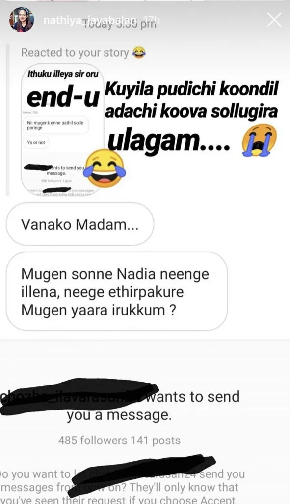 In a series of Instagram stories, Nathiya Jayabalan clarified that she is NOT the person Mugen is referring to. Nathiya decided to even poke fun at the whole situation by trolling Instagram followers with her responses.