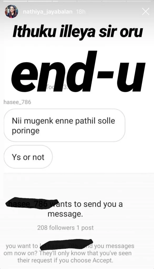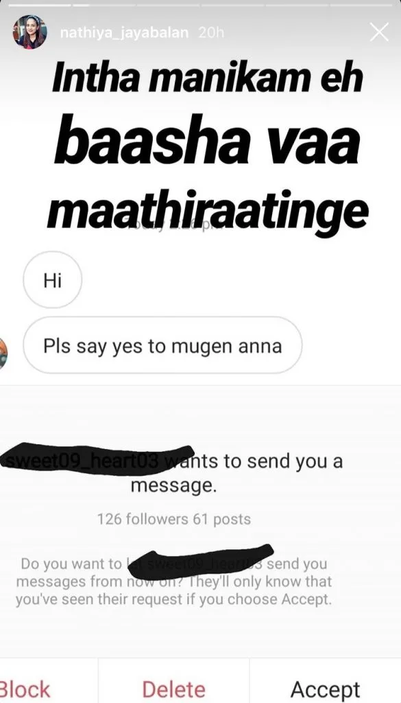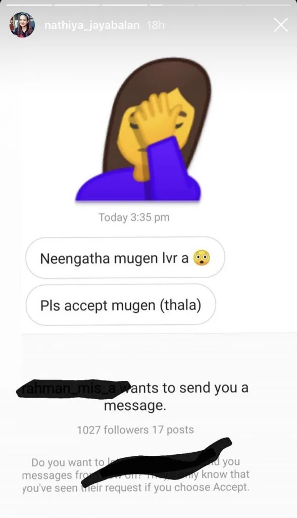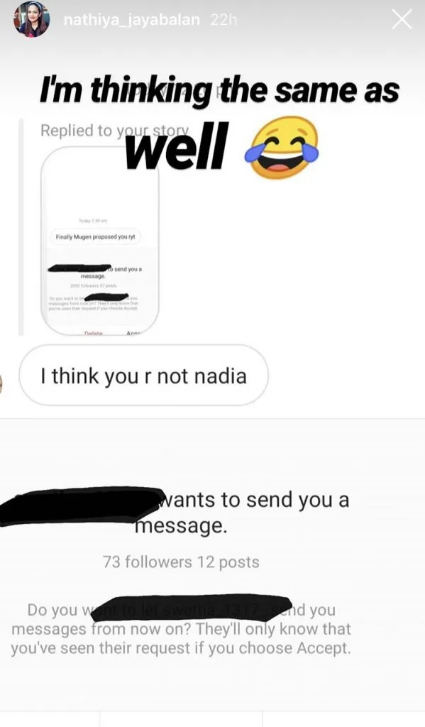 In a series of Instagram stories, Nathiya Jayabalan clarified that she is NOT the person Mugen is referring to. Nathiya decided to even poke fun at the whole situation by trolling Instagram followers with her responses.