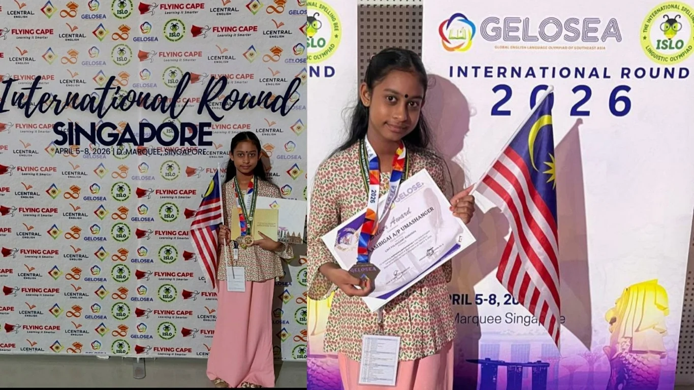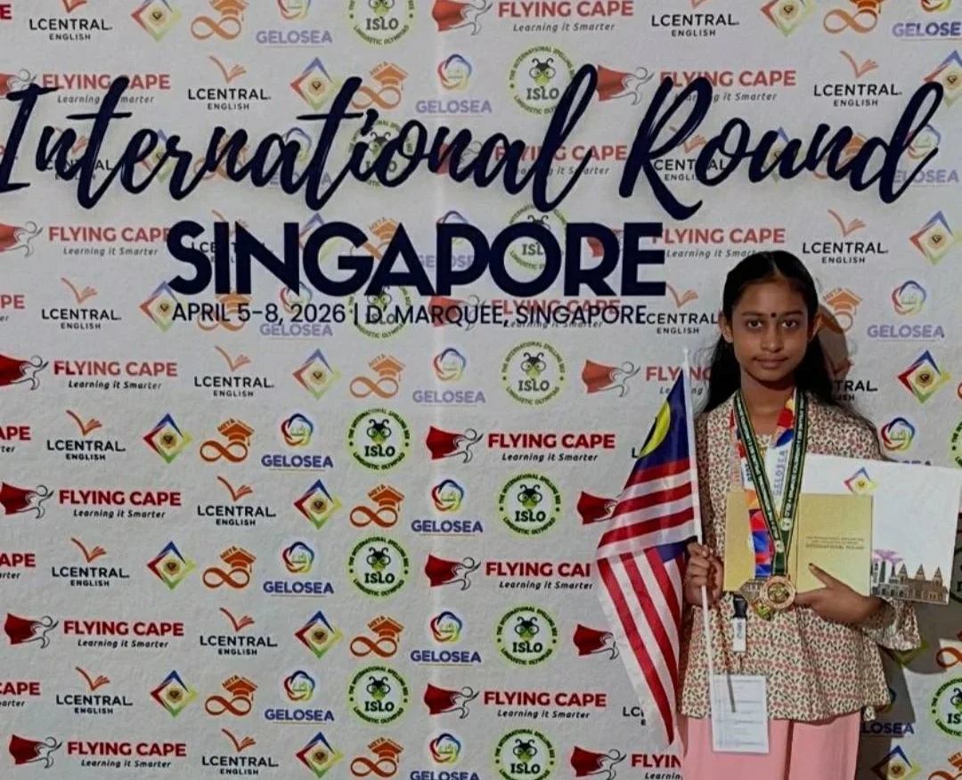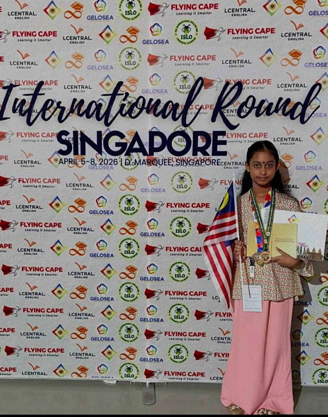 In a significant achievement, Mahaambigai AP Umashanger from SJKT Palanisamy Kumaran, Sungai Petani, Kedah participated in the Global English Language Olympiad South East Asia (GELOSEA) and the International Spelling Linguistics Olympiad (ISLO). The competitions took place from April 5 to April 8, 2026, at D’Marqee in Singapore.