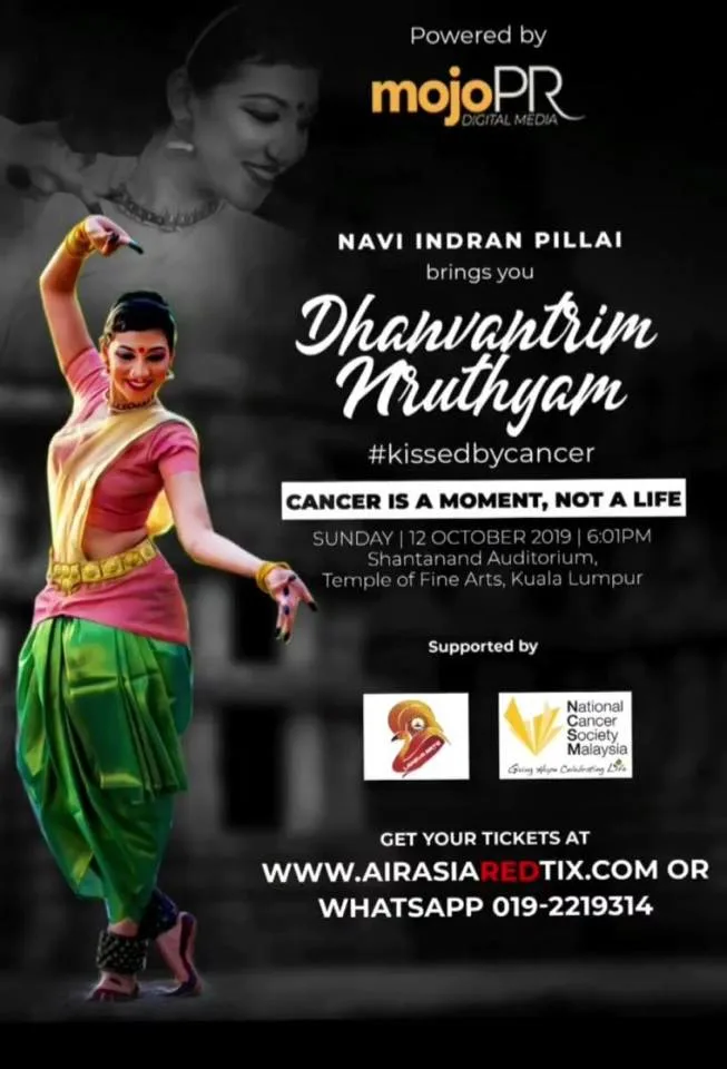 In conjunction with Breast Cancer Awareness month, Navi will be performing a Bharatanatyam solo recital called Dhanvantrim Nruthyam #kissedbycancer. This fundraiser event is hoping to aid Navi with her lifelong cancer treatment. Dhanvantrim Nruthyam #kissedbycancer will be held on 12th Oct at the Shantanand Auditorium, Temple of Fine Arts, Kuala Lumpur from 6.01PM onwards.