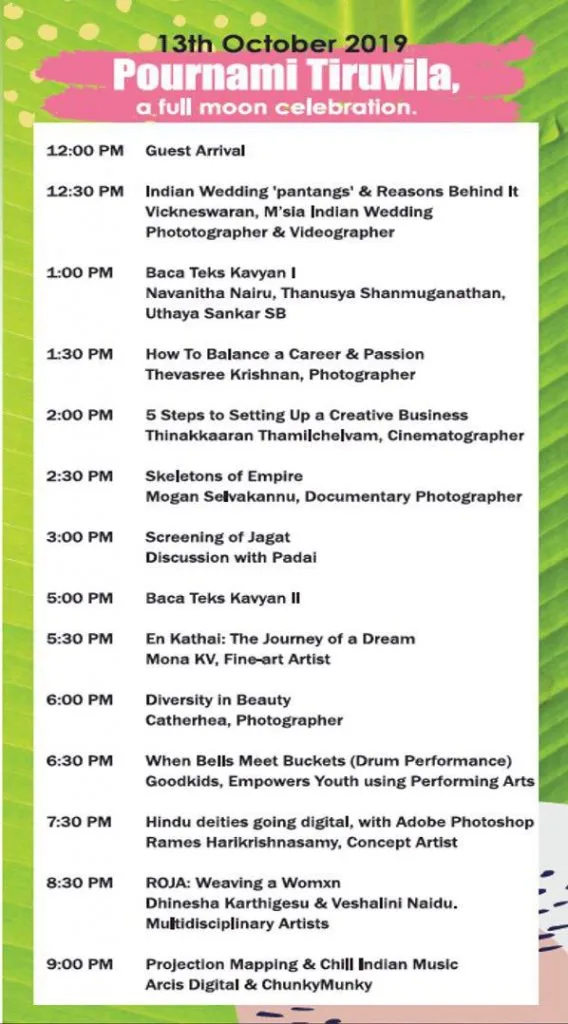 Pournami Tiruvila: Full Moon Celebration is a one day art festival organised by Malaysian Indians for all Malaysians, in conjunction with the ongoing art exhibition, Banana Leaf: A Celebration of Malaysian Indian Arts & Culture.