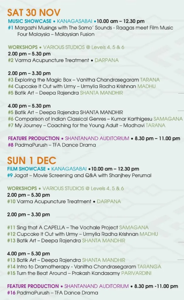 There will be two exciting weekends of performances by local artistes, a feature dance-drama and musical extravaganza. In addition, there are workshops, talks, lecture demonstrations and a special week-long holiday camp for children. All together, there will be over 34 events for attendees to indulge in!