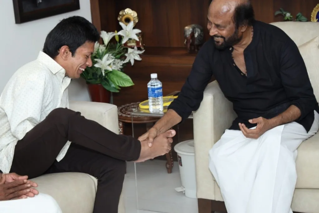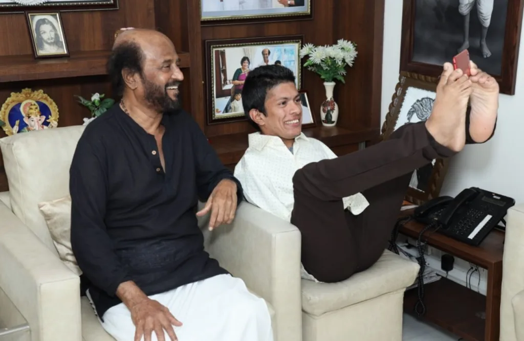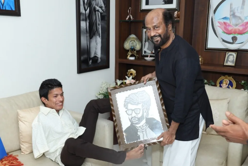The artist, who was born without both hands, recently met Rajinikanth in Chennai. Known for his paintings, Pranav presented a portrait of Rajinikanth to the Superstar himself. The heartwarming photos of their interaction are making rounds of the internet. Rajinikanth even posed for a selfie with Pranav, who took the photo using his foot.