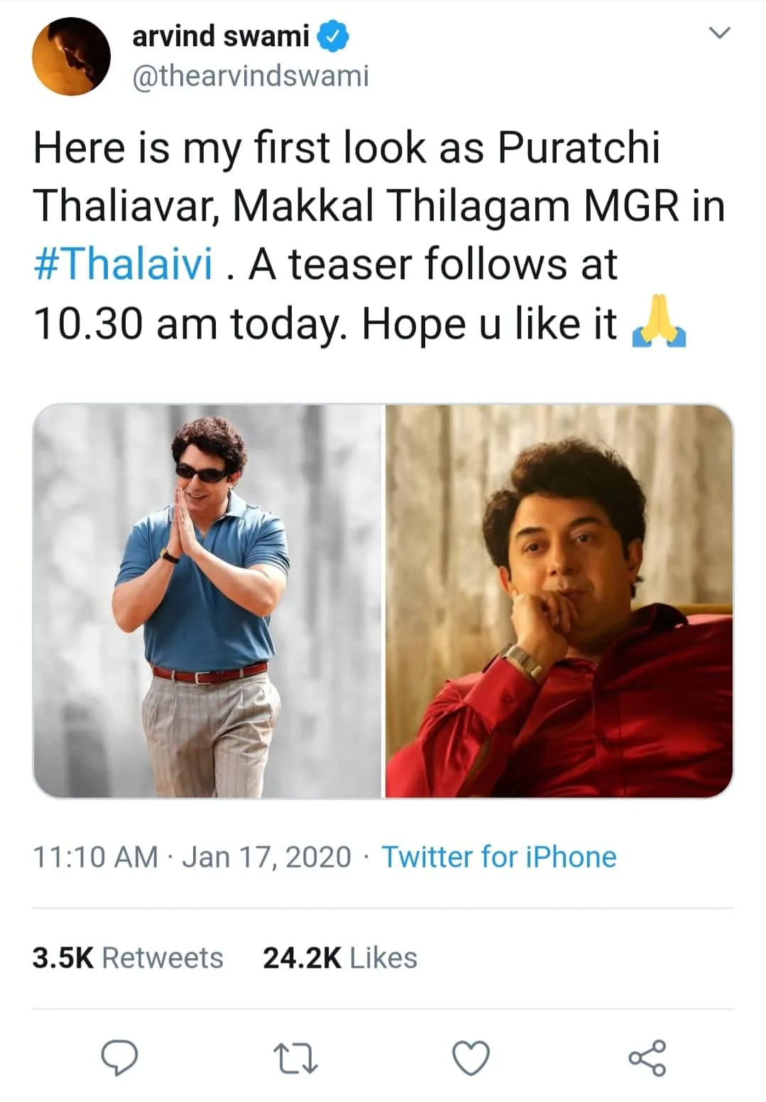 On the birth anniversary of the late MGR the Thalaivi team has revealed the first look of actor Arvind Swami as Makkal Thilagam MGR.