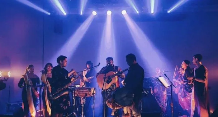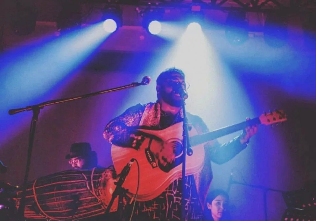 Santosh with the band at his album launch. Image credit: Instagram @raaghari