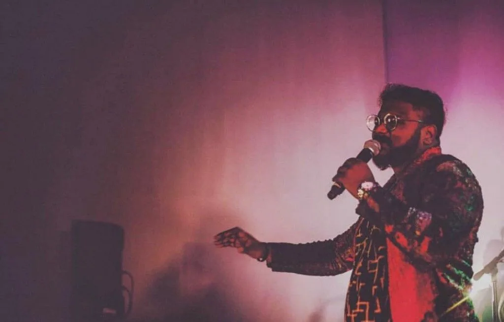 Santosh takes the stage to a rousing applause from the audience. He harnessed that very energy into his first song, the chilling Aradhana, a tune dedicated to his nieces. It was one of those jaw-dropping moments when he began singing that night. It almost didn’t feel real to see Santosh on the stage, illuminated by a single red stage light as he began singing, “Vaanil irunthe vizhum malai, boomiyil thodangum ilaya,” (The rain that falls from the sky continues on the earth)