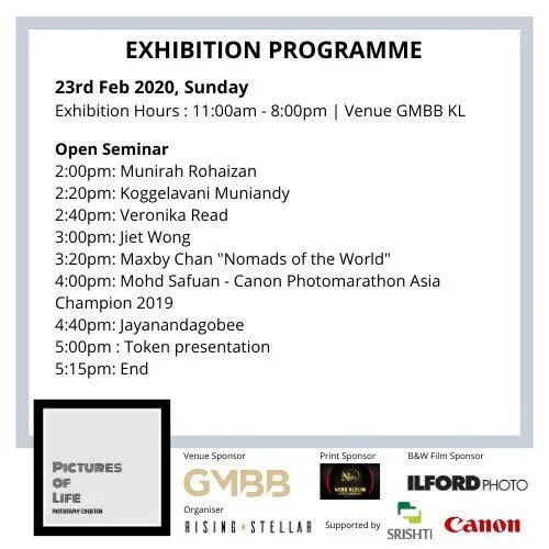 Pictures of Life is supported by Canon Malaysia and Srishti Malaysia. The exhibition is also sponsored by Neha Album and Ilford Photo. GMBB Kuala Lumpur is the venue sponsor for the event.