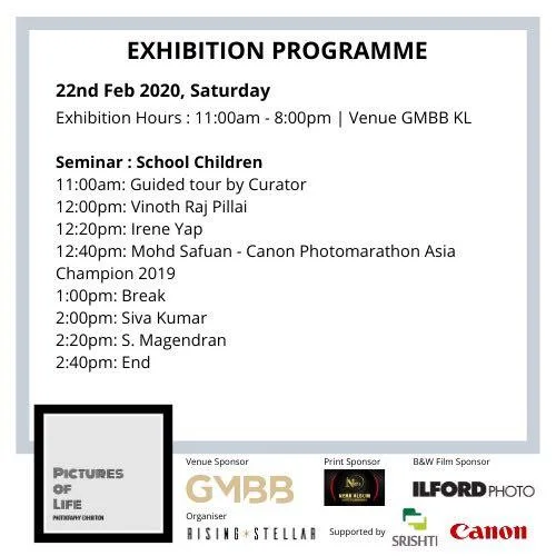 On the 22nd and 23rd of February 2020, Pictures of Life will be hosting guided tours and seminars. The seminars on Saturday are targeted towards those still schooling, and will feature photographers Vinoth Raj Pillai, Irene Yap, Mohd Safuan, Siva Kumar and S Magendran giving short talks on their work.