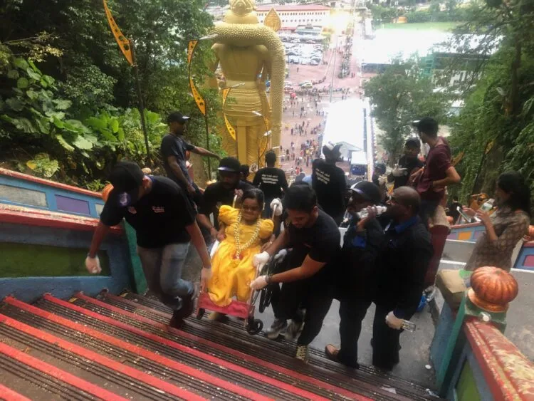 The organisation founder Dr A Muraly and approximately 250 volunteers carried the wheelchair-bound devotees up the 272 steps up to the Batu Caves temple.