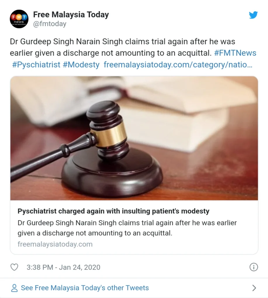 According to a report by the Malay Mail on October 18th when he was charged, he was accused of uttering offensive words at his former patient – who is also a rape survivor – at Thomson Hospital Kota Damansara at around 4.30pm on February 12th last year.