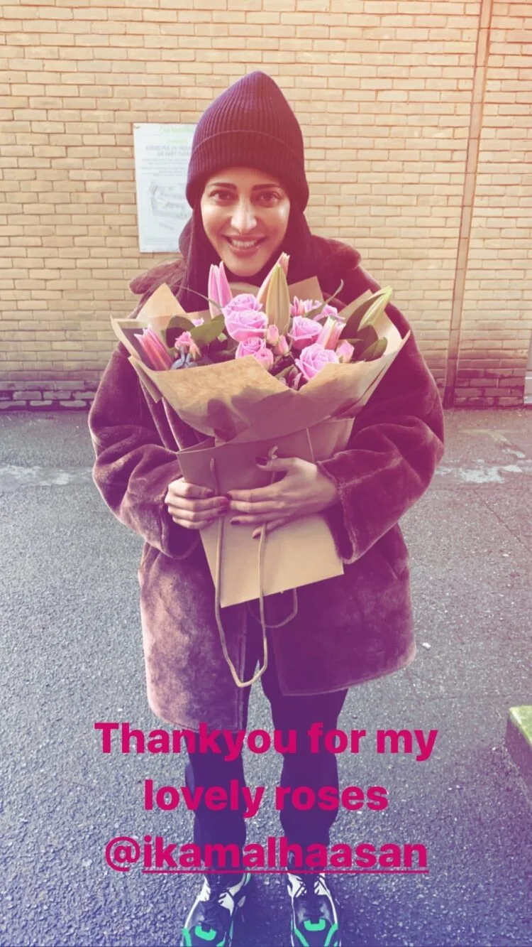 She also shared a photo of herself with a bouquet of flowers which were sent by her father Ulaganayagan Kamal Haasan. She captioned the photo, “Thank you for my lovely roses @ikamalhaasan (sic)”
