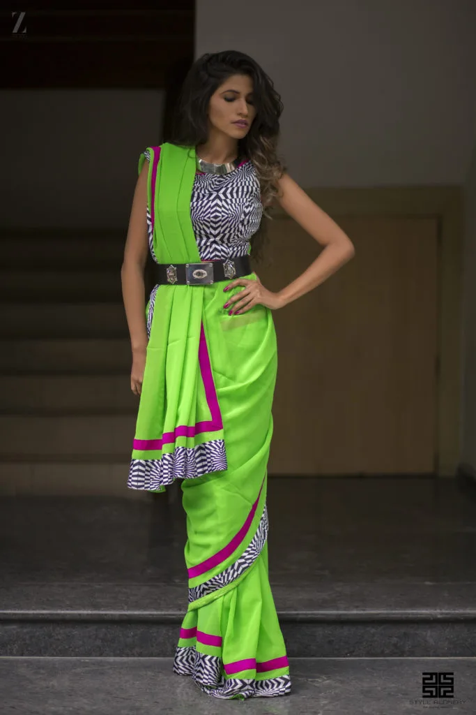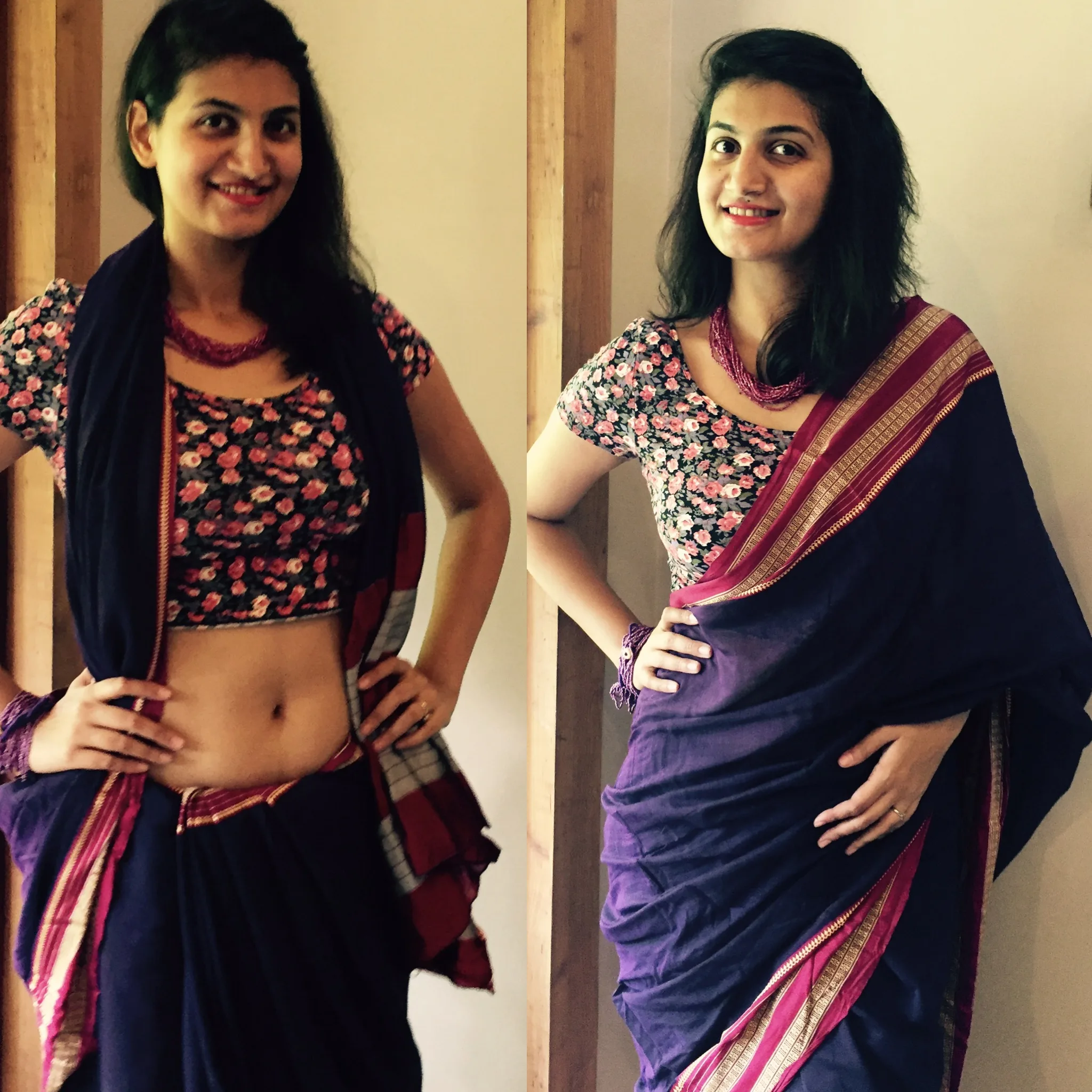 Regular t-shirts, collared shirts, or even blouses can be paired with the saree. Fashion week in India shows us runways peppered with models strutting in sarees paired with shirts and vests. This really begs the question as to why we are so hesitant to do this here, when we are actually showing less skin than we would with a normal saree blouse.