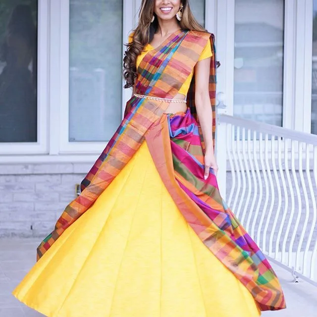 Okay, at first we weren’t impressed by this idea too. But seeing how flattering the drape can be left us speechless. A simple YouTube search will yield many videos on how to drape a saree with a pair of jeans, pants or leggings. A pair of heels compliments the look, but if you’d rather wear flats, go for it!