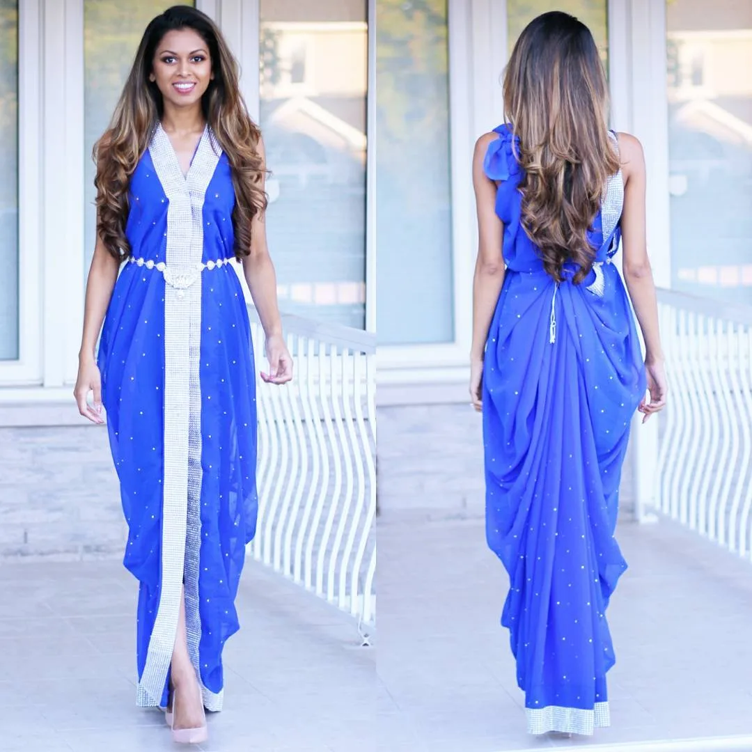The saree jumpsuit/dress might be a little out there, solely because not many people are using it for events which one would normally use a saree to. This style of draping is surprisingly easy, with the right type of saree, of course.