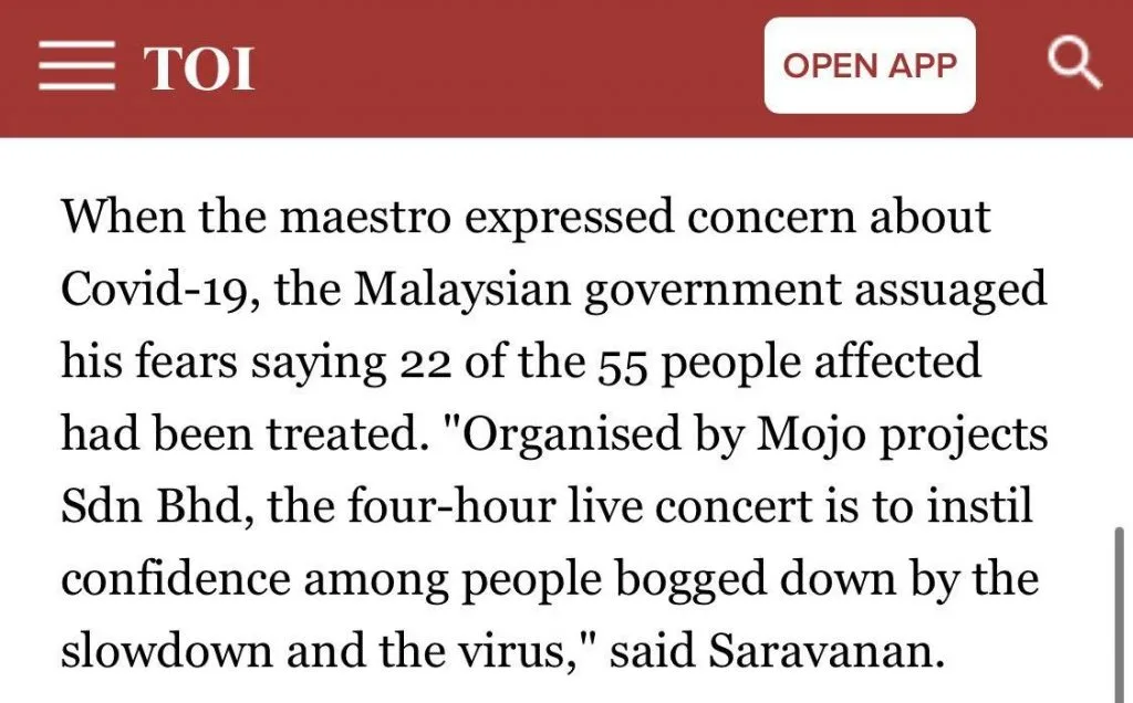 This concert appears to be on track for this weekend, despite Illayaraaja himself voicing concerns over the possible pandemic at a recently held press conference in India. He was assuaged by the representatives of the Malaysian government saying that 22 of the 55 people infected have been treated (as of 7th March 2020).