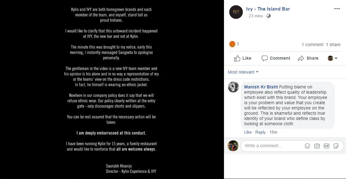 @bishnoikuldeep My shocking experience with discrimination at Kylin and Ivy, Ambience Vasant Kunj this evening. Denied entry as ethnic wear is not allowed! A restaurant in India allows ‘smart casuals’ but not Indian wear! Whatever happened to pride in being Indian? Take a stand! pic.twitter.com/ZtJJ1Lfq38
