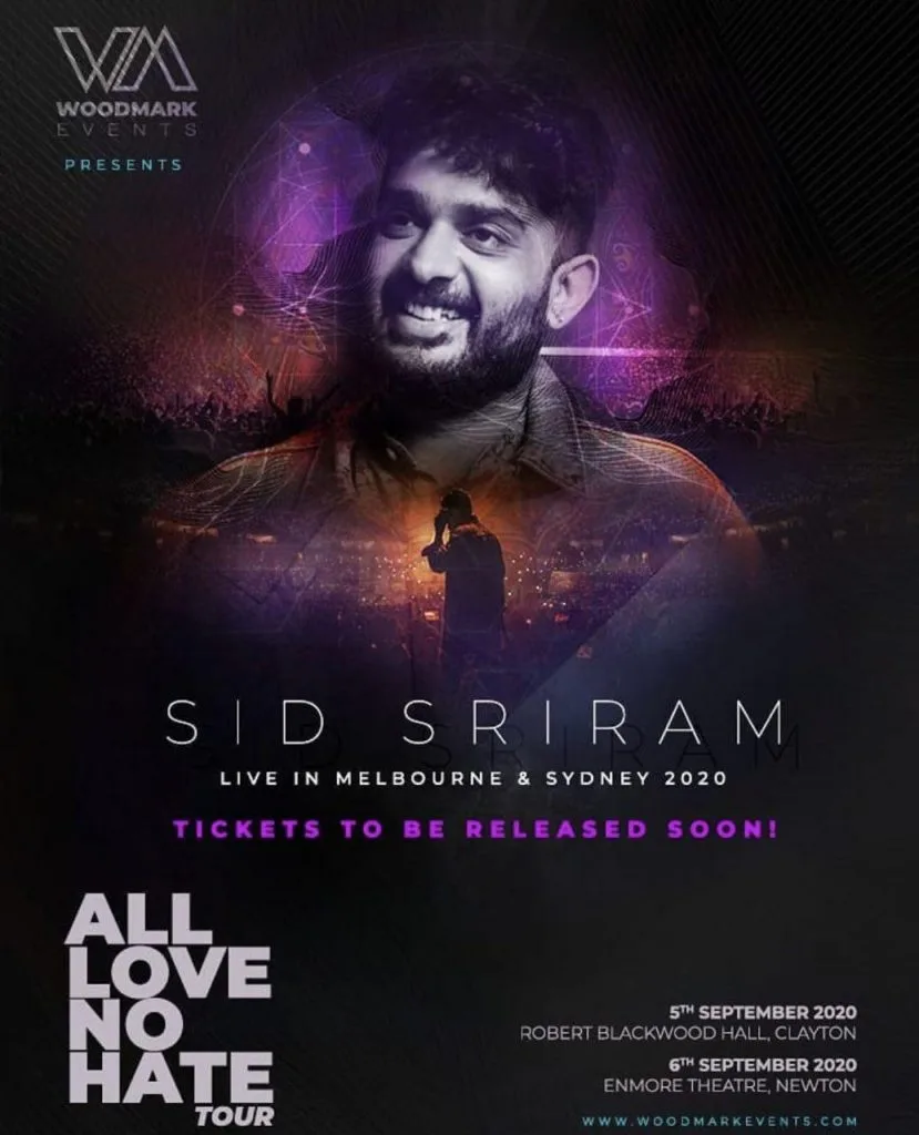 Why are we bothered about a concert that’s being held on another continent, you ask? The organisers of Sid Sriram Live in Melbourne & Sydney 2020 are the Malaysian events company, Woodmark Events. The two concerts are slated for September 2020, but tickets have not gone on sale just yet.