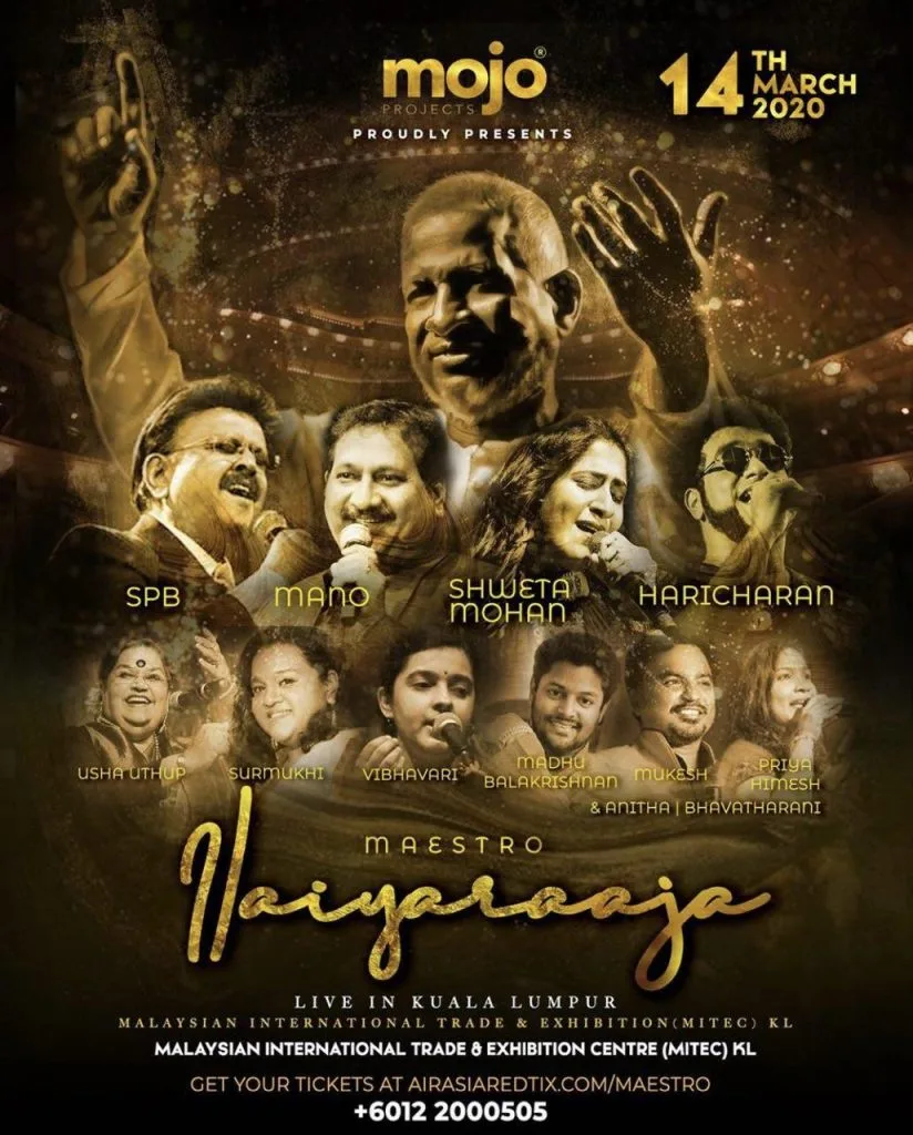 Purported to be the biggest concert of the year, Mojo Projects’ Maestro Ilaiyaraaja Live in Kuala Lumpur had the attention of all us Tamil music fans from the start of 2020. Come 14th March, it wasn’t just the legendary composer, we would also be entertained by SP Balasubrahmanyam, Mano, Haricharan, Shweta Mohan, Usha Uthup, Surmukhi, Vibhavari, Madhu Balakrishnan, Mukesh, Priya Himesh, Bhavatharini and Anitha.