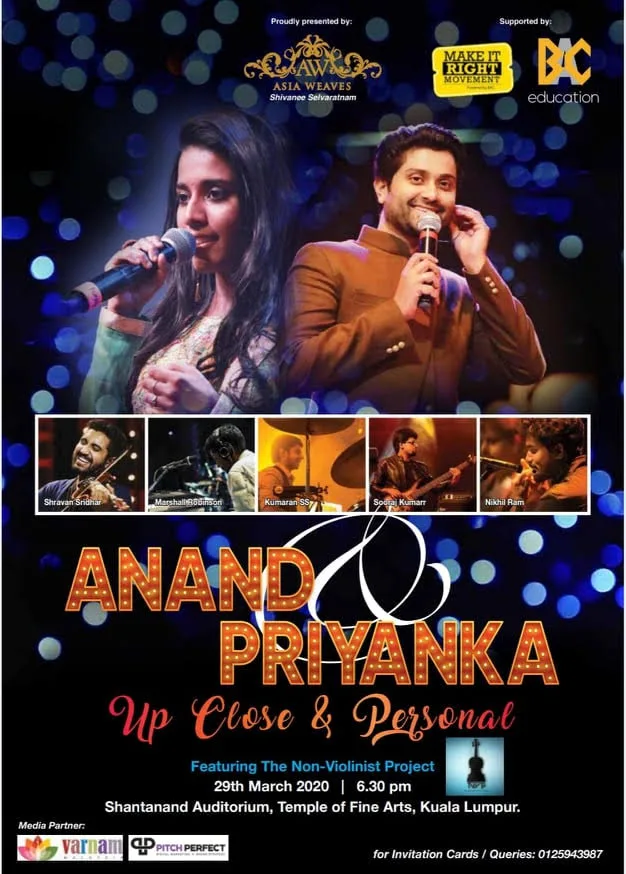 This concert featuring Super Singer talents Anand Aravindakshan and Priyanka NK was scheduled to take place on the 29th of March at the Shantanand Auditorium, Kuala Lumpur. After the government announced the Movement Control Order (MCO), the organisers, Asia Weaves, postponed the event to the 9th of August. The concert is scheduled to take place at the same time and venue.
