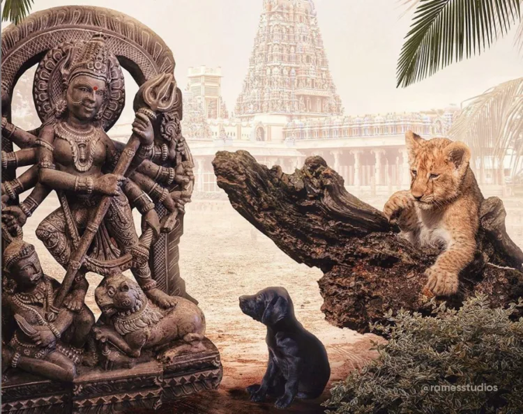 In an Instagram post depicting a statue of the Goddess Durga, a lion and a black dog, Rames tells a story about a lion, the pet of Goddess Durga who stumbles upon a black dog who was lamenting its blackness.