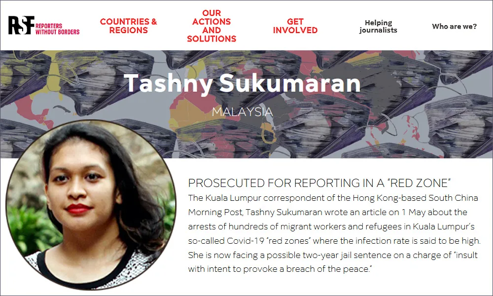 Tashny Sukumaran, the Malaysian news correspondent of South China Morning Post, has been selected by Reporters Without Borders (RSF) as one of the 30 coronavirus Information Heroes.