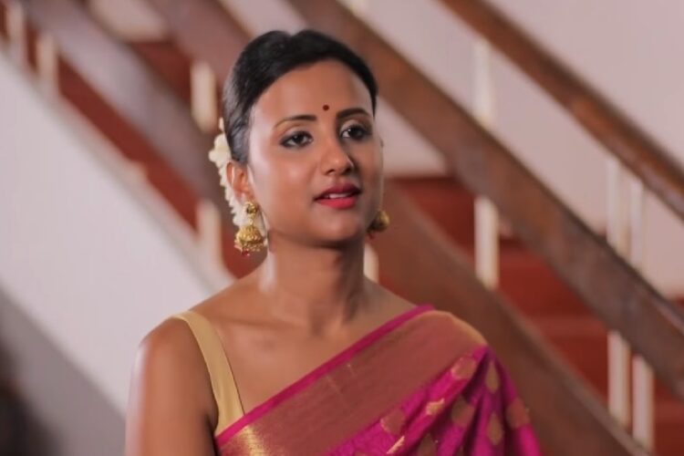The photo appears to be a screenshot from her time spent on Enga Veetu Mapillai, donning a traditional attire and holding a bouquet.