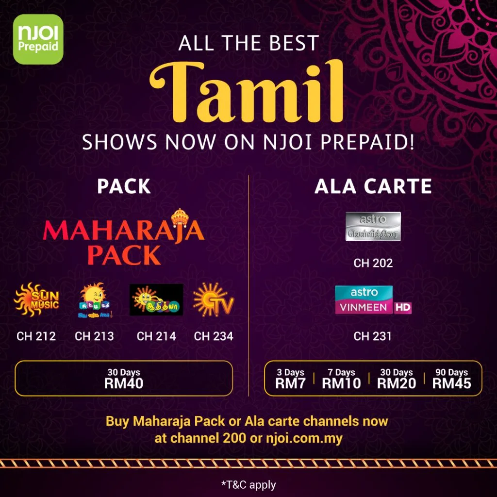 While Kollywood fans can enjoy more Tamil content with the addition of the Maharaja Pack, showcasing the best of Tamil entertainment via SUN TV, SUN Music, Chutti TV and Adithya at only RM40 for 30 days. Tamil channels, Astro Vellithirai (CH 202) and Astro Vinmeen HD (CH 231), can be obtained from as low as RM7 for 3 days for each channel. The Maharaja Pack, Astro Vellithirai and Astro Vinmeen HD channels are available from 5 August 2020 onwards.