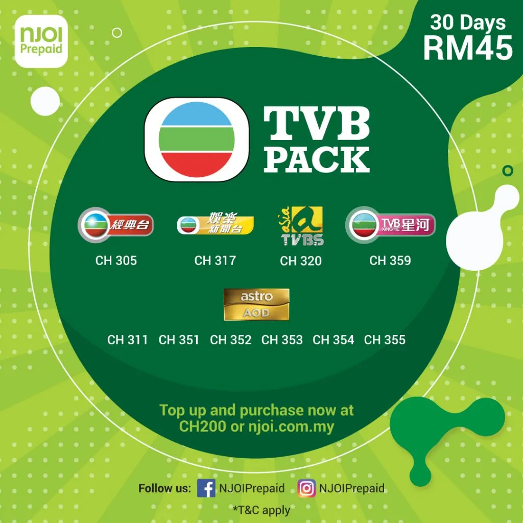 Commencing from 3rd of August onwards, all NJOI customers could rejoice with an additional 2 packages consisting of TVB, Maharaja and 4 new ala-carte channels; CGTN, CTI Asia, Astro Vellithirai and Astro Vinmeen HD.