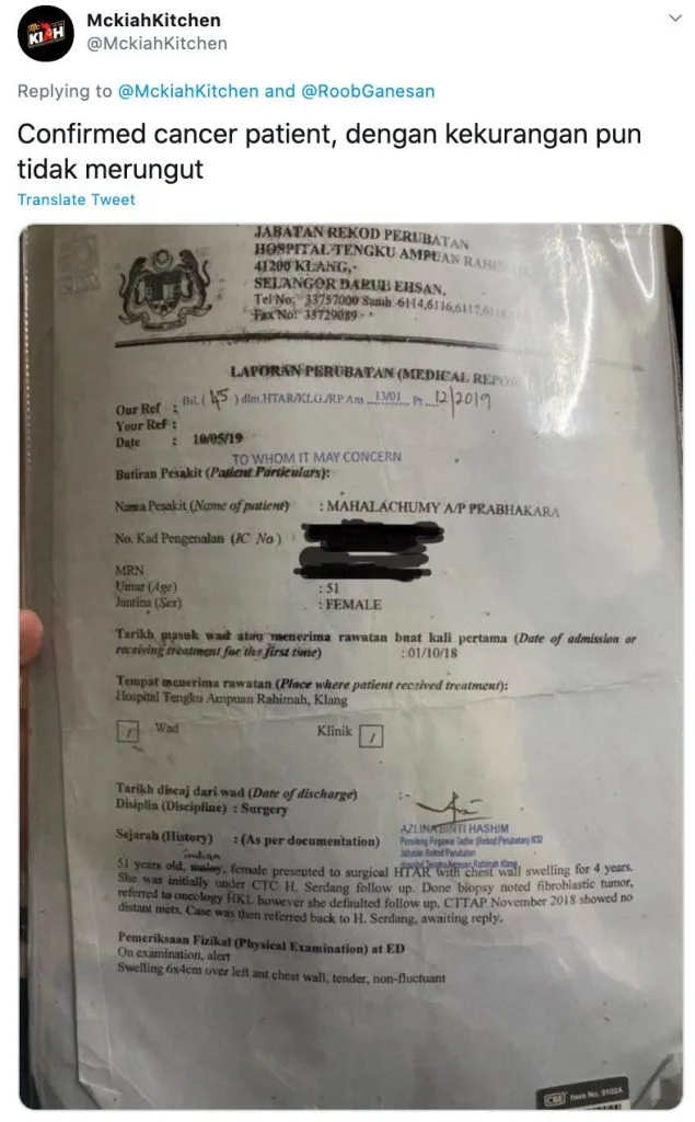 A Twitter user took to his personal account to share about Mahalachumy. He also further stated that she was eagerly seeking for a better job to keep herself going.