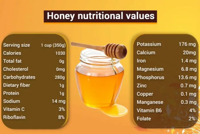 1 tablespoon of honey (21 grams ) contains 64 calories and 17 grams of sugar including fructose, glucose, maltose, and sucrose. It virtually contains no fiber, fat, or protein. It even includes small levels below 1% of the RDI of some vitamins and minerals, although you will need to consume lots of pounds to satisfy your everyday needs.