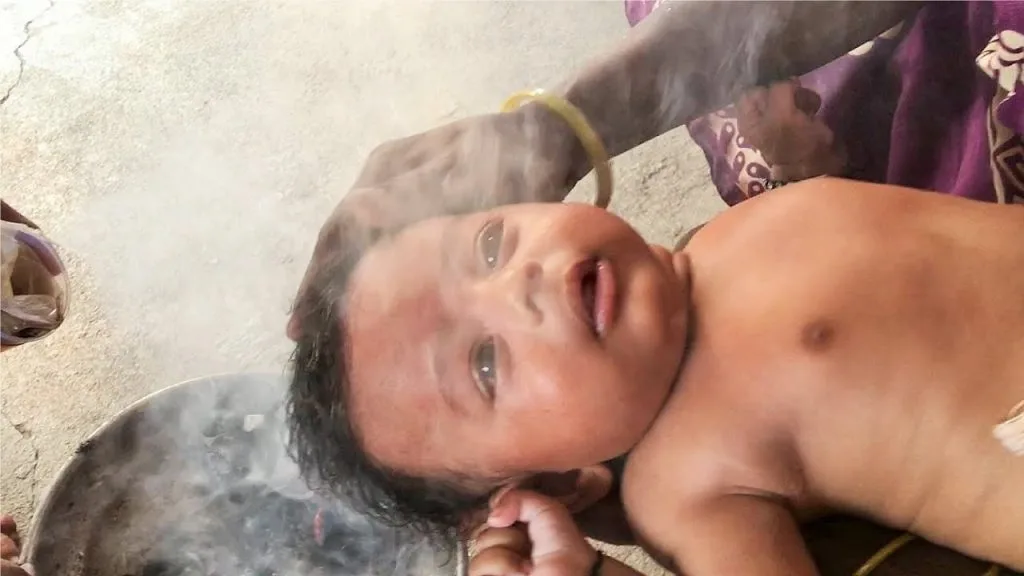 Babies are held above the incense smoke after shower to open up their nasal way and to dry up excess water on the body. REMEMBER, this should only be done for few seconds.