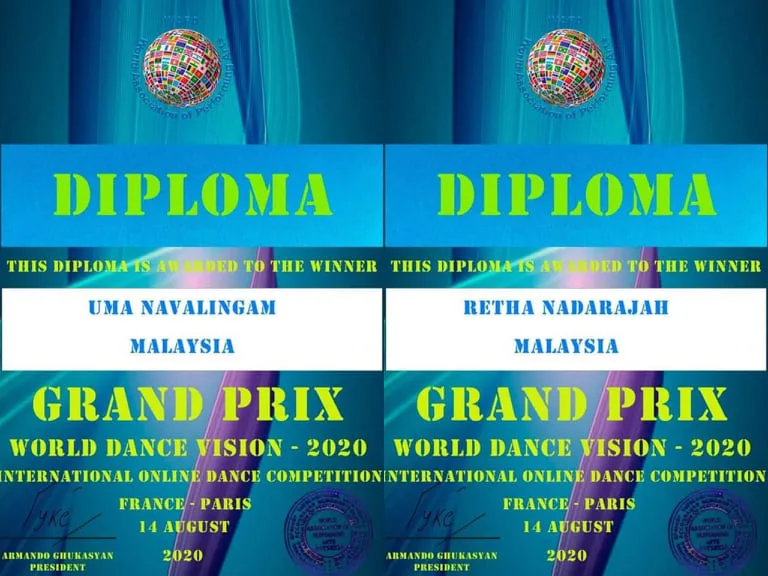 It was an exhilarating moment when two Malaysian indian teachers enthralling dance performance was recognised with the awarding of a Diploma Certificate during an online dance competition held virtually in France, Paris.