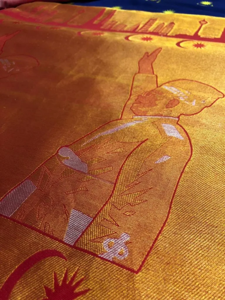 The pattu/zari (embellished with gold) and velli pattu (embellished with silver) is one of the reasons Kanjivaram sarees are celebrated with pride and joy at any occasion. Traditionally, the gold threads used in these sarees are actual beaten gold filaments. For this Merdeka saree, the pallu/mundhani (decorated end) is designed to independently weave our Bapa Kemerdekan Tunku Abdul Rahman alongside our signature architectural buildings to celebrate unity, freedom and independence.